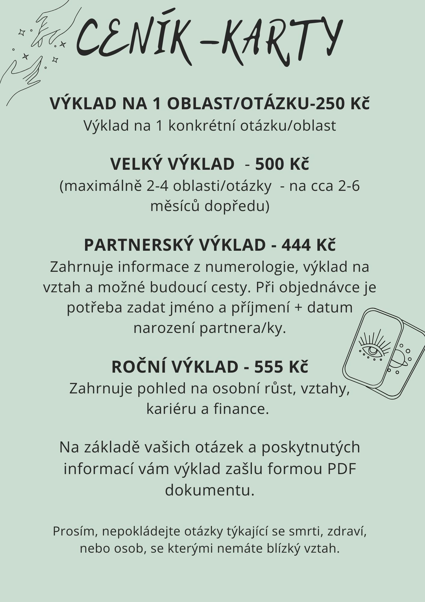 Ráda vám pomohu najít odpovědi na vaše otázky pomocí tarotových karet, které doplňuji také o andělské karty. Společně nám tyto nástroje umožní nahlédnout do vaší životní situace a najít inspiraci, jaké kroky podniknout dál. Do výkladu přidávám i trošku numerologie. Výklad vám poskytne náhled do možných cest budoucnosti, ale je důležité mít na paměti, že tarot není nevyhnutelný osud, ale spíše vedení, jak lépe porozumět svému životu a okolnostem.